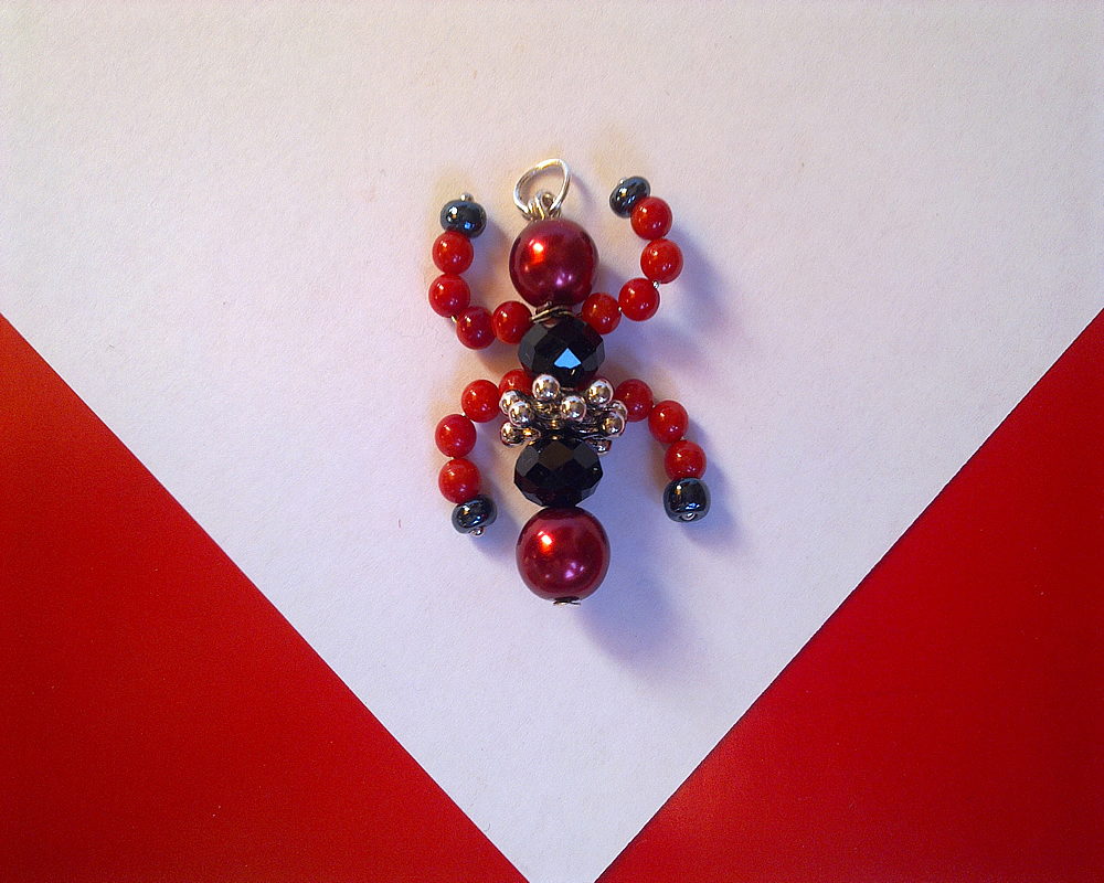 Pandantiv - gandacel din sarma modelata, coral, perle, cristale negre, argint tibetan, unicat, lucrat manual