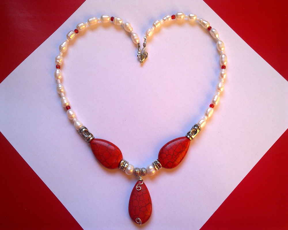 Colier realizat din perle albe de cultura si howlit rosu, argint tibetan,