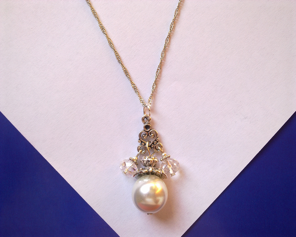 Pandantiv din cristale de sticla, perla mare si argint tibetan,