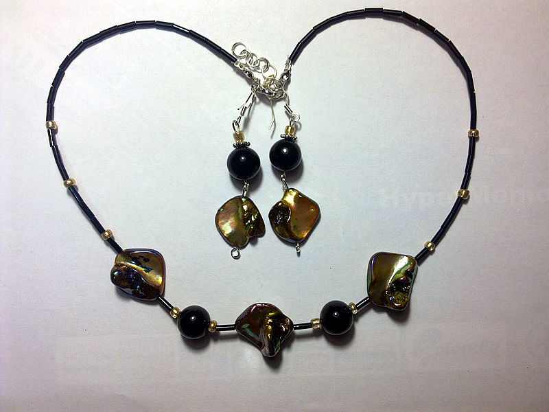 Colier si cercei din onix si scoici aurii cu reflexe verzui.
