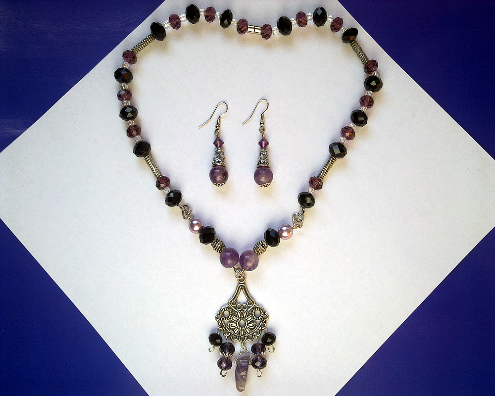 Set colier si cercei din cristale mov si negre si pietre semipretioase - ametist, argint tibetan, cerceii sunt din ametist, cristale swarovski mov, argint tibetan; sunt disponibile si separat, saculet organza cadou.
