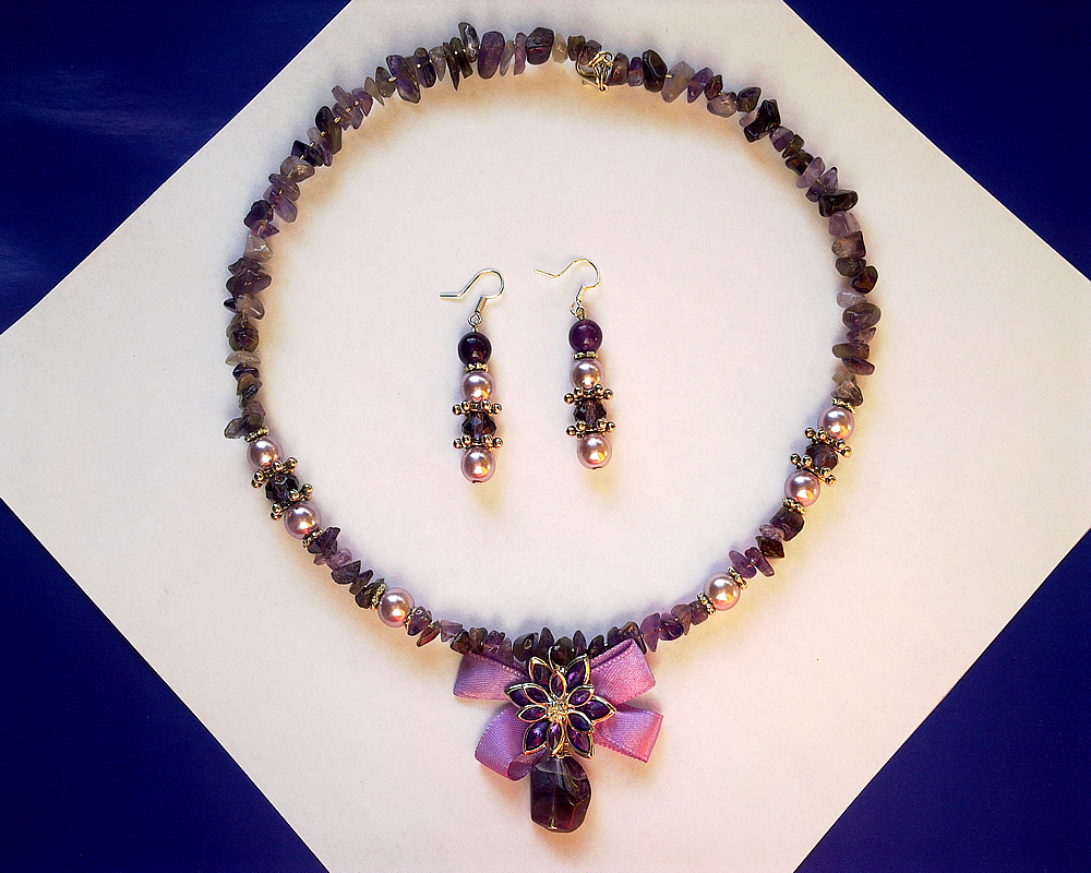 Model set-00059 Set cercei si colier din pietre semipretioase - ametist, cristale mov, perle lila, colier cu fundita din satin, sunt disponibile si separat, ambalaj cadou. Pret : 59 lei